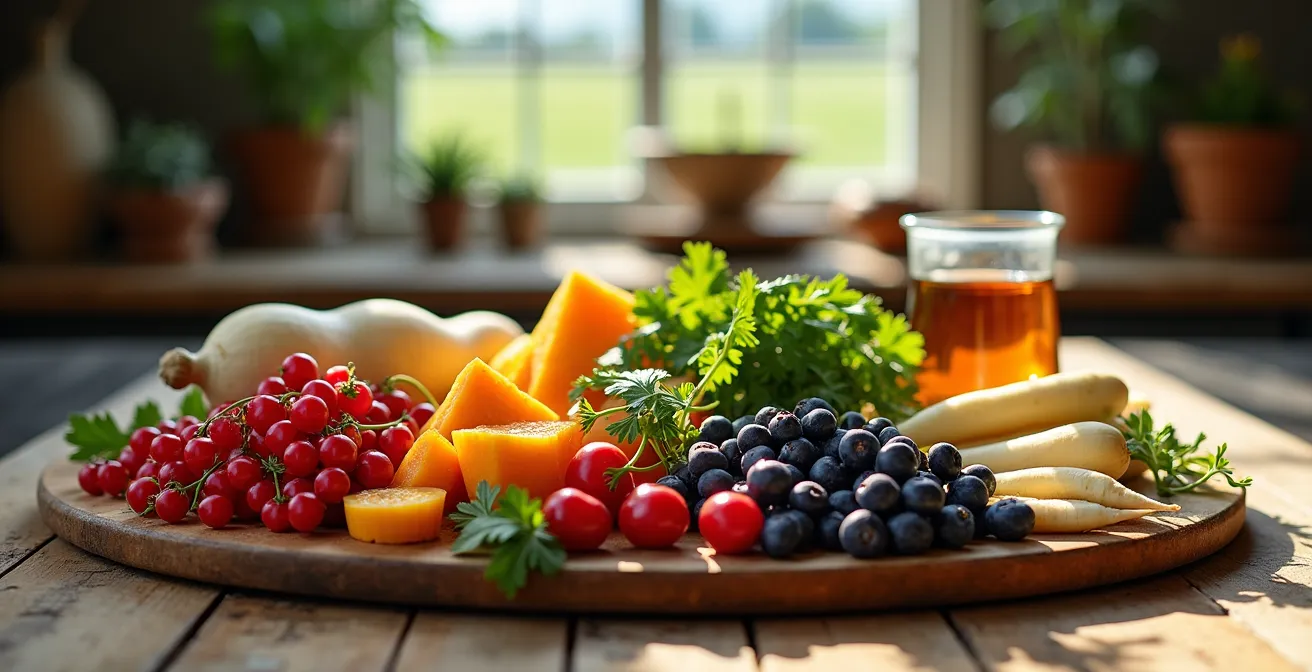 Chaque couleur correspond à des phytonutriments différents avec des bienfaits spécifiques. Le rouge des tomates et des canneberges est dû au lycopène et aux proanthocyanidines, bénéfiques pour la santé cardiaque et urinaire. L’orange des carottes et des courges signale la présence de bêta-carotène, que le corps transforme en vitamine A, essentielle pour la vision. Le vert des épinards et des têtes de violon est riche en chlorophylle et en lutéine. Le bleu/violet des bleuets sauvages du Lac-Saint-Jean indique une forte concentration d’anthocyanes, réputées pour leurs effets sur la mémoire et la fonction cérébrale.